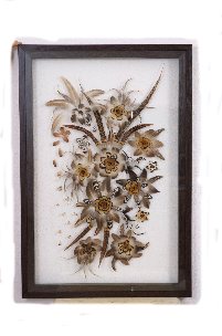 Натуральные перья из разных видов птиц собранные на стекле (2мм) образуют композицию похожие на цветы. Такое гармоничное слияние флоры и фауны делает картину живой в прямом смысле этого слова. Заметьте, что благодаря стеклу полотном становится сама стена, где помещена картина. При этом создаётся ощущение, будто композиция собрана на стене,