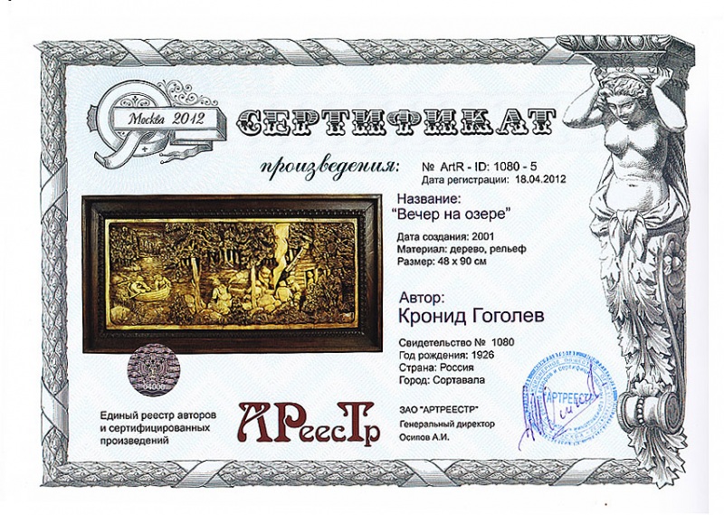 Online система регистрации арт-объектов artreestr / Сертификаты произведений членов «АРТ реестра» / Гоголев Кронид Александрович / Вечер на озере