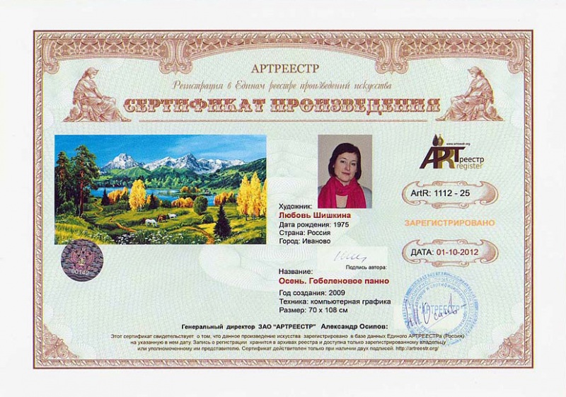 Online система регистрации арт-объектов artreestr / Сертификаты произведений членов «АРТ реестра» / Шишкина Любовь Витальевна / Осень