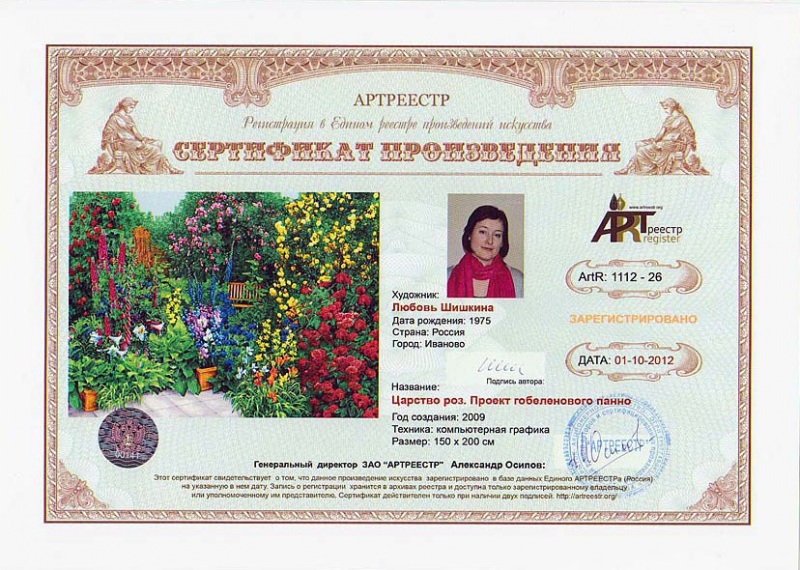 Online система регистрации арт-объектов artreestr / Сертификаты произведений членов «АРТ реестра» / Шишкина Любовь Витальевна / Царство роз