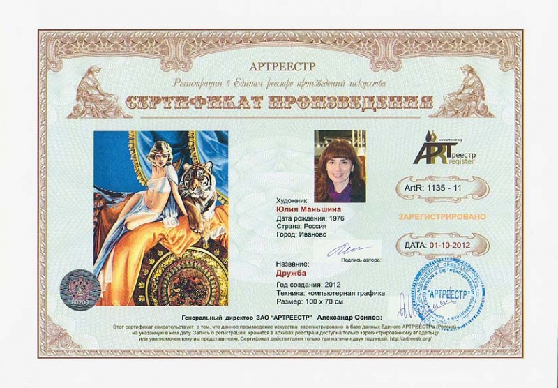 Online система регистрации арт-объектов artreestr / Сертификаты произведений членов «АРТ реестра» / Маньшина Юлия Николаевна / Дружба