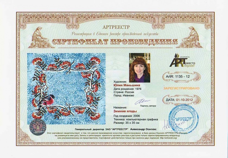 Online система регистрации арт-объектов artreestr / Сертификаты произведений членов «АРТ реестра» / Маньшина Юлия Николаевна / Зимние ягоды