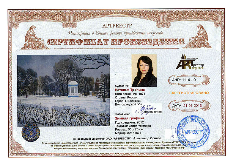 Online система регистрации арт-объектов artreestr / Сертификаты произведений членов «АРТ реестра» / Тропина Наталья Сергеевна / Зимняя графика