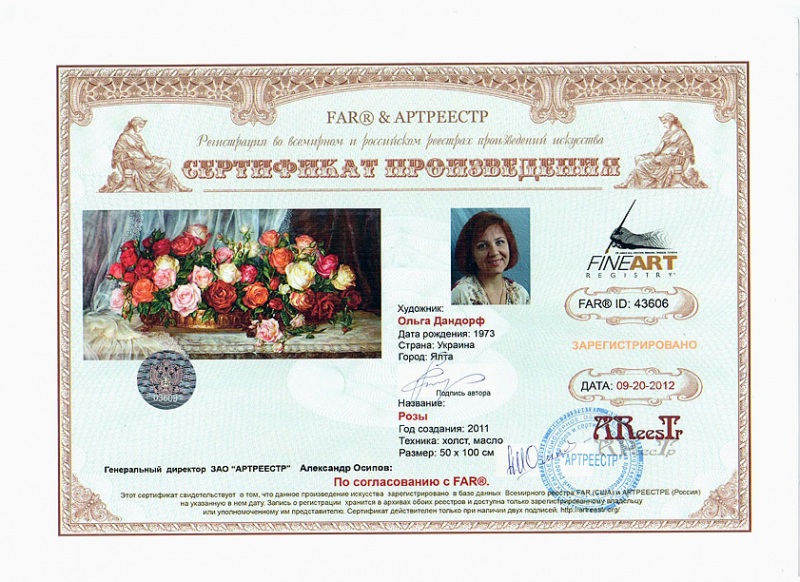 Online система регистрации арт-объектов artreestr / Сертификаты произведений членов «АРТ реестра» / Дандорф Ольга Владимировна / Розы