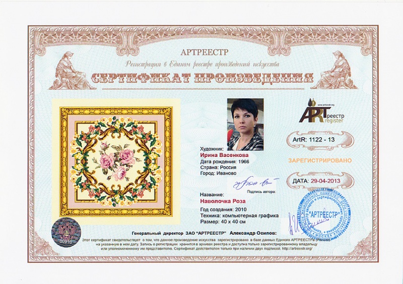 Online система регистрации арт-объектов artreestr / Сертификаты произведений членов «АРТ реестра» / Васенкова Ирина Владимировна / Наволочка Роза