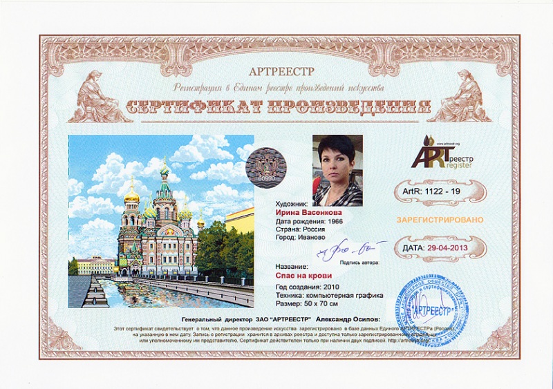 Online система регистрации арт-объектов artreestr / Сертификаты произведений членов «АРТ реестра» / Васенкова Ирина Владимировна / Спас на крови