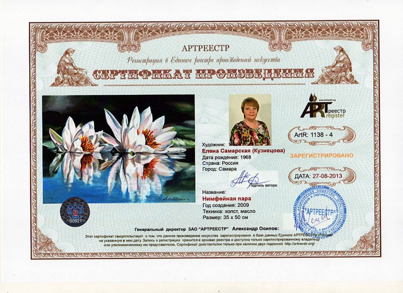 Online система регистрации арт-объектов artreestr / Сертификаты произведений членов «АРТ реестра» / Самарская Елена / Нимфейная пара