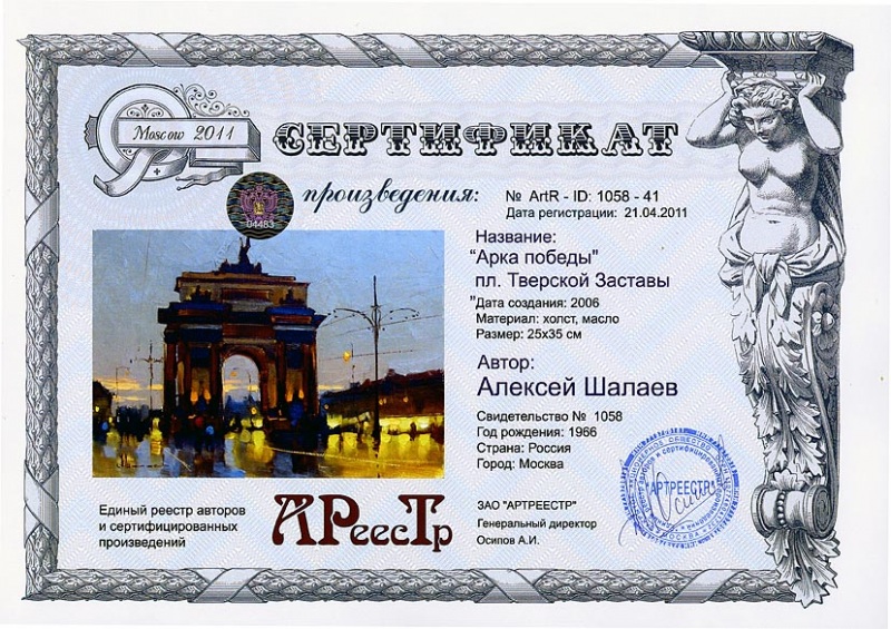 Online система регистрации арт-объектов artreestr / Сертификаты произведений членов «АРТ реестра» / Шалаев Алексей Евгеньевич / "Арка победы" пл. Тверской Заставы