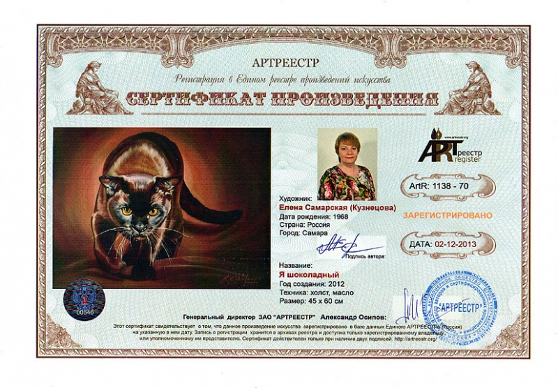 Online система регистрации арт-объектов artreestr / Сертификаты произведений членов «АРТ реестра» / Самарская Елена / Я шоколадный