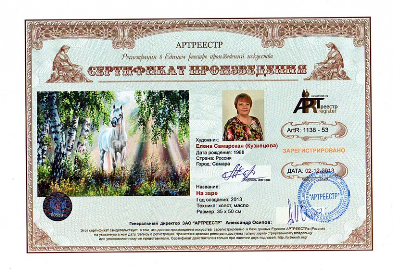 Online система регистрации арт-объектов artreestr / Сертификаты произведений членов «АРТ реестра» / Самарская Елена / На заре
