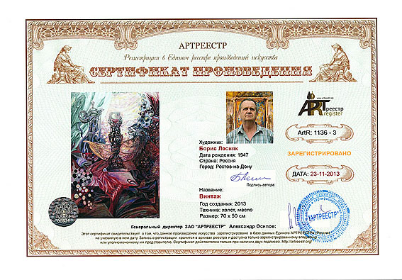 Online система регистрации арт-объектов artreestr / Сертификаты произведений членов «АРТ реестра» / Лесняк Борис Михайлович / Винтаж