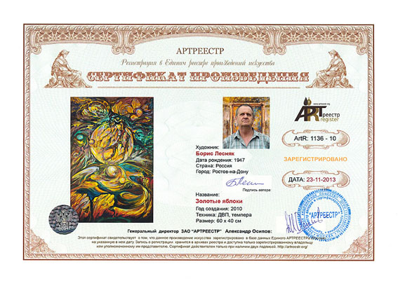 Online система регистрации арт-объектов artreestr / Сертификаты произведений членов «АРТ реестра» / Лесняк Борис Михайлович / Золотые яблоки