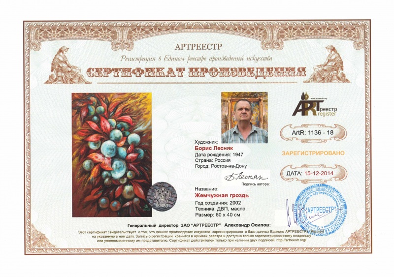 Online система регистрации арт-объектов artreestr / Сертификаты произведений членов «АРТ реестра» / Лесняк Борис Михайлович / Жемчужная гроздь
