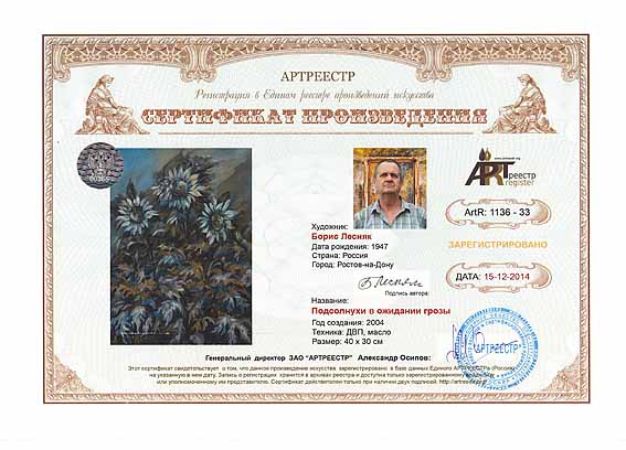Online система регистрации арт-объектов artreestr / Сертификаты произведений членов «АРТ реестра» / Лесняк Борис Михайлович / Подсолнухи в ожидании грозы