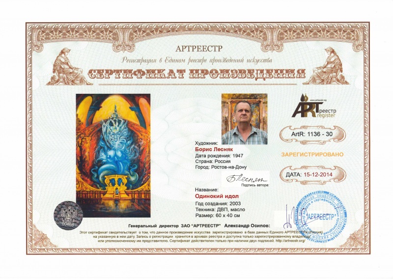 Online система регистрации арт-объектов artreestr / Сертификаты произведений членов «АРТ реестра» / Лесняк Борис Михайлович / Одинокий идол