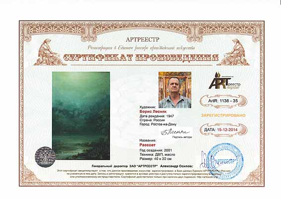 Online система регистрации арт-объектов artreestr / Сертификаты произведений членов «АРТ реестра» / Лесняк Борис Михайлович / Рассвет
