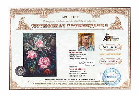 Online система регистрации арт-объектов artreestr / Сертификаты произведений членов «АРТ реестра» / Лесняк Борис Михайлович / Розы на чёрном