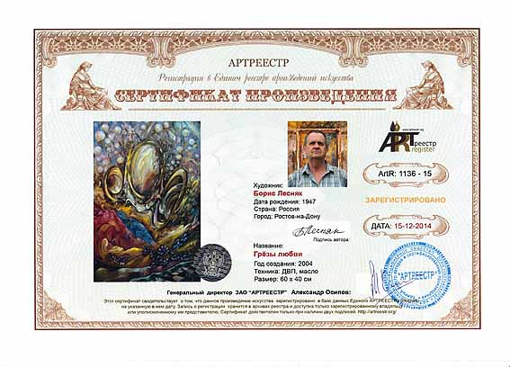 Online система регистрации арт-объектов artreestr / Сертификаты произведений членов «АРТ реестра» / Лесняк Борис Михайлович / Грезы любви