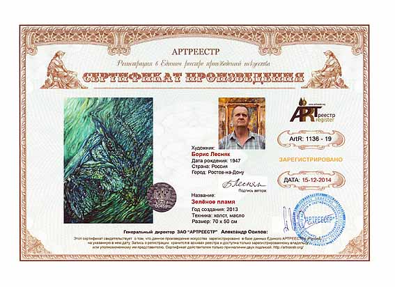 Online система регистрации арт-объектов artreestr / Сертификаты произведений членов «АРТ реестра» / Лесняк Борис Михайлович / Зеленое пламя