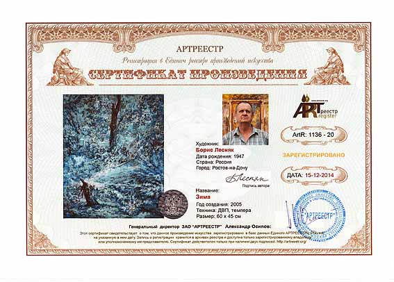 Online система регистрации арт-объектов artreestr / Сертификаты произведений членов «АРТ реестра» / Лесняк Борис Михайлович / Зима