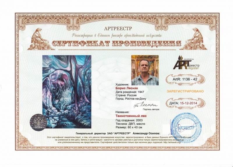 Online система регистрации арт-объектов artreestr / Сертификаты произведений членов «АРТ реестра» / Лесняк Борис Михайлович / Таинственный лес