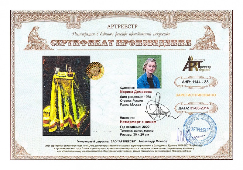 Online система регистрации арт-объектов artreestr / Сертификаты произведений членов «АРТ реестра» / Домарева Марина Владимировна / Натюрморт с вином