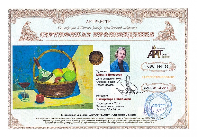 0 0 0 0 0   Online система регистрации арт-объектов artreestr / Сертификаты произведений членов «АРТ реестра» / Домарева Марина Владимировна / Натюрморт с яблоками