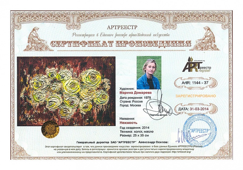 0 0 0 0 0   Online система регистрации арт-объектов artreestr / Сертификаты произведений членов «АРТ реестра» / Домарева Марина Владимировна / Нежность