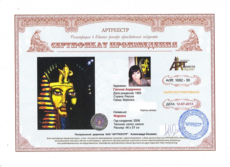 Online система регистрации арт-объектов artreestr / Сертификаты произведений членов «АРТ реестра» / Андреева Галина Викторовна / Фараон