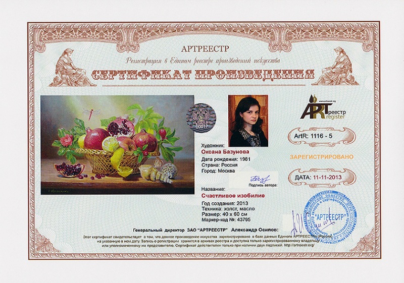 Online система регистрации арт-объектов artreestr / Сертификаты произведений членов «АРТ реестра» / Базунова Оксана Юрьевна / Счастливое изобилие