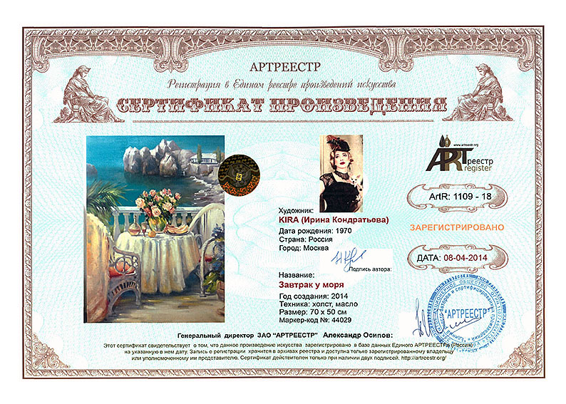 0 0 0 0 0   Online система регистрации арт-объектов artreestr / Сертификаты произведений членов «АРТ реестра» / Кондратьева Ирина Петровна (KIRA) / Завтрак у моря