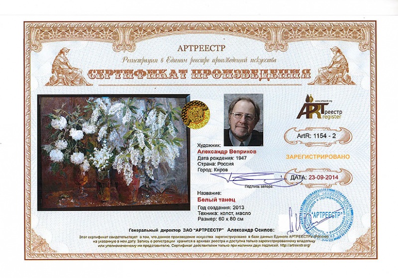 Online система регистрации арт-объектов artreestr / Сертификаты произведений членов «АРТ реестра» / Веприков Александр Иванович / Белый танец