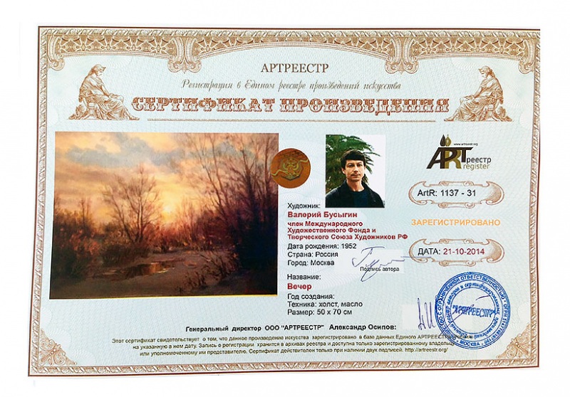 Online система регистрации арт-объектов artreestr / Сертификаты произведений членов «АРТ реестра» / Бусыгин Валерий / Вечер