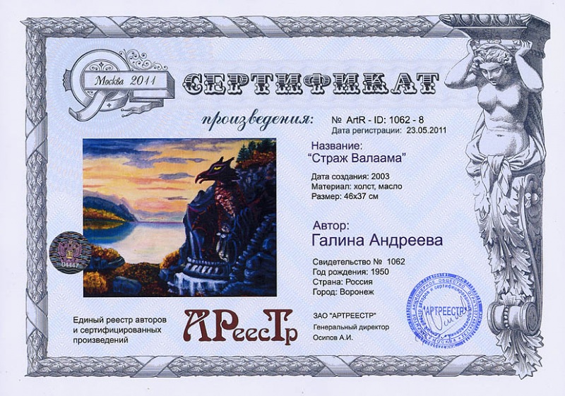 Online система регистрации арт-объектов artreestr / Сертификаты произведений членов «АРТ реестра» / Андреева Галина Викторовна / Страж Валаама