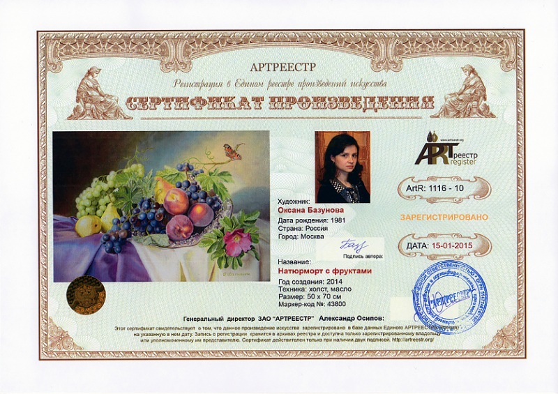 Online система регистрации арт-объектов artreestr / Сертификаты произведений членов «АРТ реестра» / Базунова Оксана Юрьевна / Натюрморт с фруктами