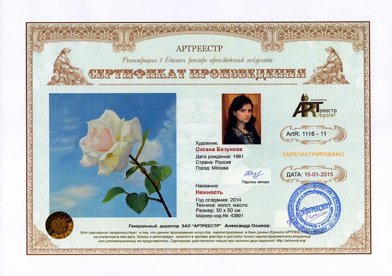 Online система регистрации арт-объектов artreestr / Сертификаты произведений членов «АРТ реестра» / Базунова Оксана Юрьевна / Нежность