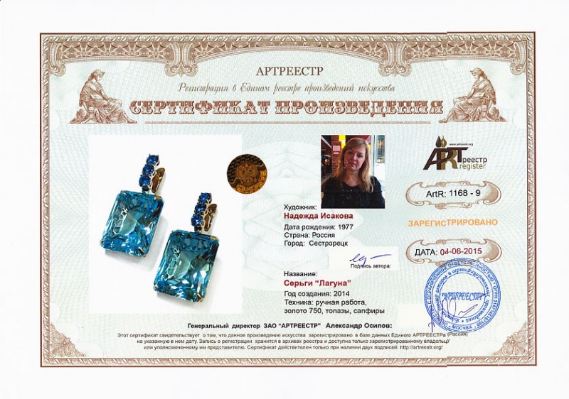 Online система регистрации арт-объектов artreestr / Сертификаты произведений членов «АРТ реестра» / Исакова Надежда Владимировна / Серьги "Лагуна"