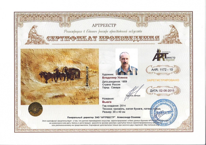 Online система регистрации арт-объектов artreestr / Сертификаты произведений членов «АРТ реестра» / Усянов Владимир Павлович / Вьюга