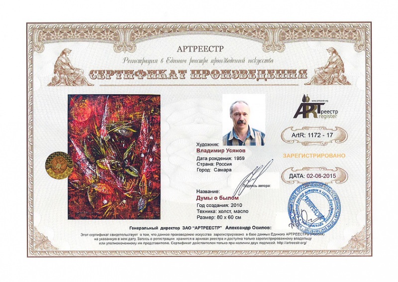 Online система регистрации арт-объектов artreestr / Сертификаты произведений членов «АРТ реестра» / Усянов Владимир Павлович / Думы о былом