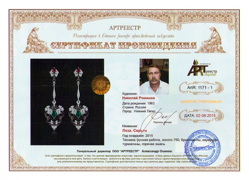 Online система регистрации арт-объектов artreestr / Сертификаты произведений членов «АРТ реестра» / Романов Николай Александрович / "Лоза". Серьги