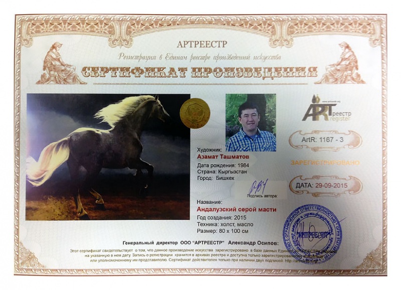 Online система регистрации арт-объектов artreestr / Сертификаты произведений членов «АРТ реестра» / Ташматов Азамат Абдухалимович / Андалузский серой масти