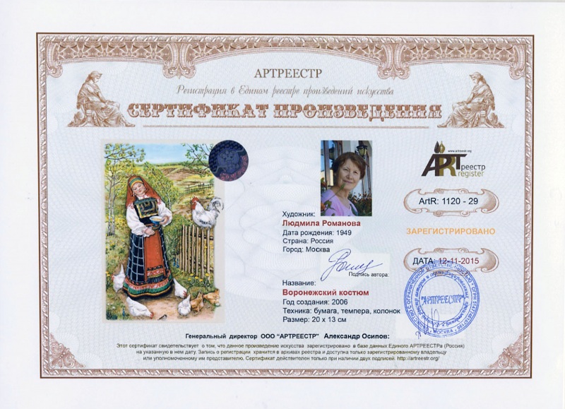 Online система регистрации арт-объектов artreestr / Сертификаты произведений членов «АРТ реестра» / Романова Людмила Николаевна / Воронежский костюм