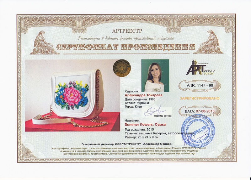 Online система регистрации арт-объектов artreestr / Сертификаты произведений членов «АРТ реестра» / Токарева Александра Васильевна / Сумка "Summer flowers"