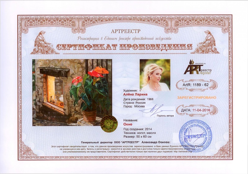 Online система регистрации арт-объектов artreestr / Сертификаты произведений членов «АРТ реестра» / Ларина Алёна / Окно
