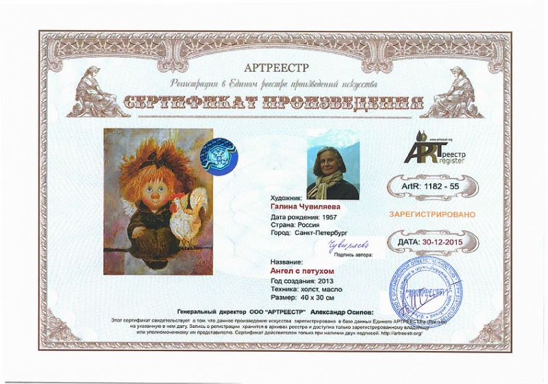 Online система регистрации арт-объектов artreestr / Сертификаты произведений членов «АРТ реестра» / Чувиляева Галина Юрьевна / Ангел с петухом