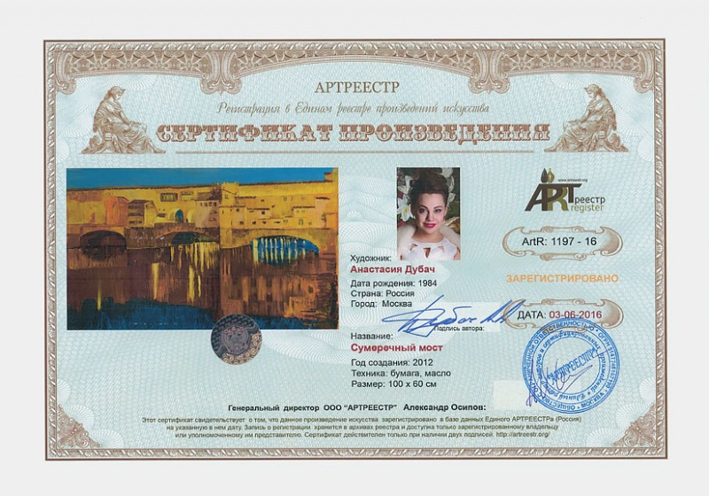 Online система регистрации арт-объектов artreestr / Сертификаты произведений членов «АРТ реестра» / Дубач Анастасия Анатольевна / Сумеречный мост