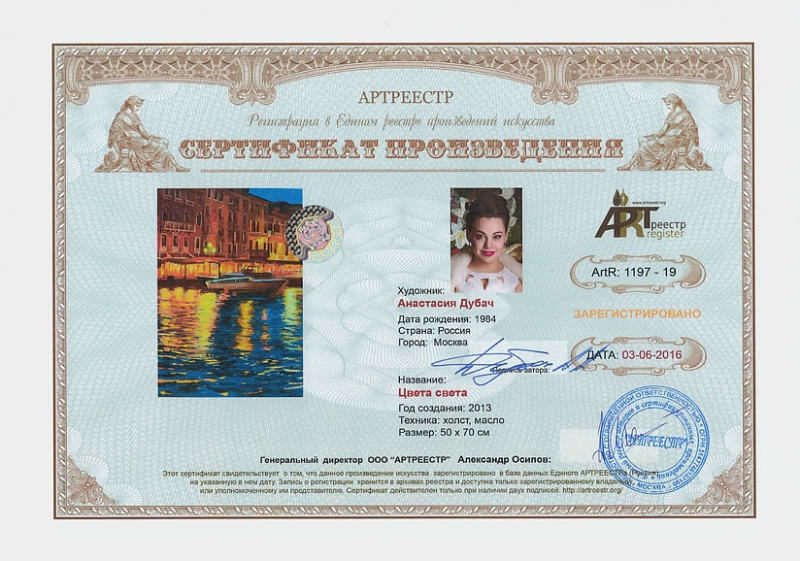 Online система регистрации арт-объектов artreestr / Сертификаты произведений членов «АРТ реестра» / Дубач Анастасия Анатольевна / Цвета света