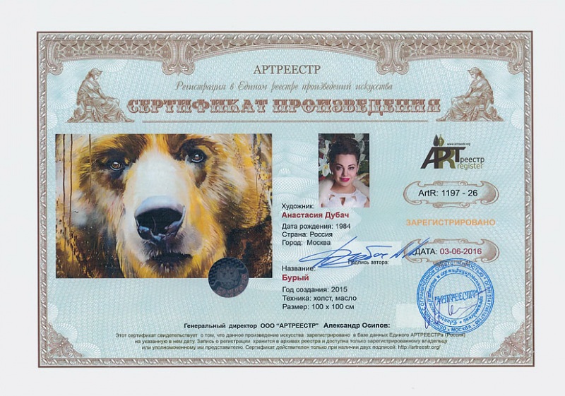 Online система регистрации арт-объектов artreestr / Сертификаты произведений членов «АРТ реестра» / Дубач Анастасия Анатольевна / Бурый