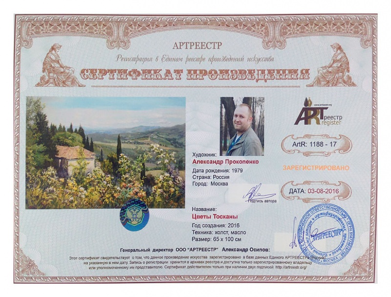 Online система регистрации арт-объектов artreestr / Сертификаты произведений членов «АРТ реестра» / Прокопенко Александр / Цветы Тосканы