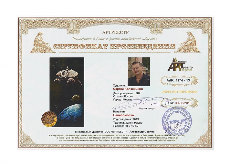 Online система регистрации арт-объектов artreestr / Сертификаты произведений членов «АРТ реестра» / Колесников Сергей Владимирович / Невесомость